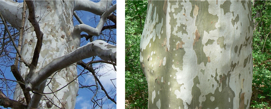 Left: Bark of the American Sycamore. Photo by Jim Thomas. Right: Bark of the London Plane tree.