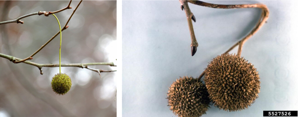 Left: American Sycamore seed. Photo by Katja Schulz. Right: London Plane seeds. Photo by T. Davis Sydnor, The Ohio State University, Bugwood.org