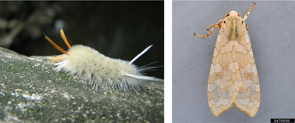 Left: Sycamore tiger moth (Halysidota harrisii ) caterpillar. Photo by Michael Hodge. Right: Sycamore tiger moth adult. Photo by Mark Dreiling, Bugwood.org.
